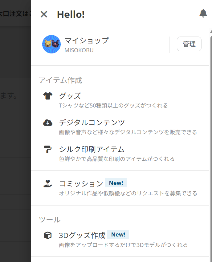 写真が用意出来たら、SUZURIに会員登録して、右上のアイコンクリックで作成メニューを開きます。