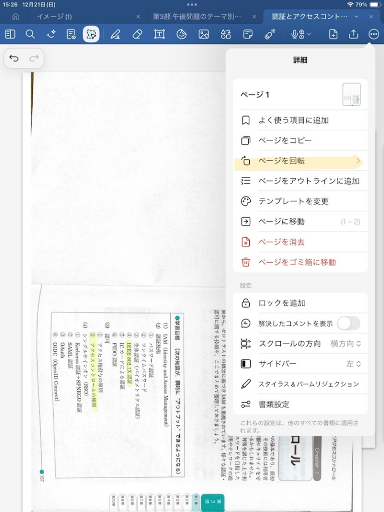 書類が読み込まれたら、右上の「…」ボタンから、「ページを回転」を選択。