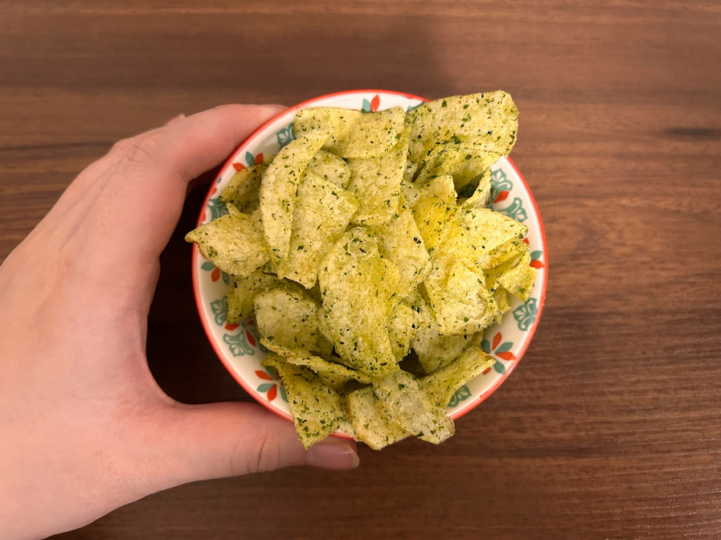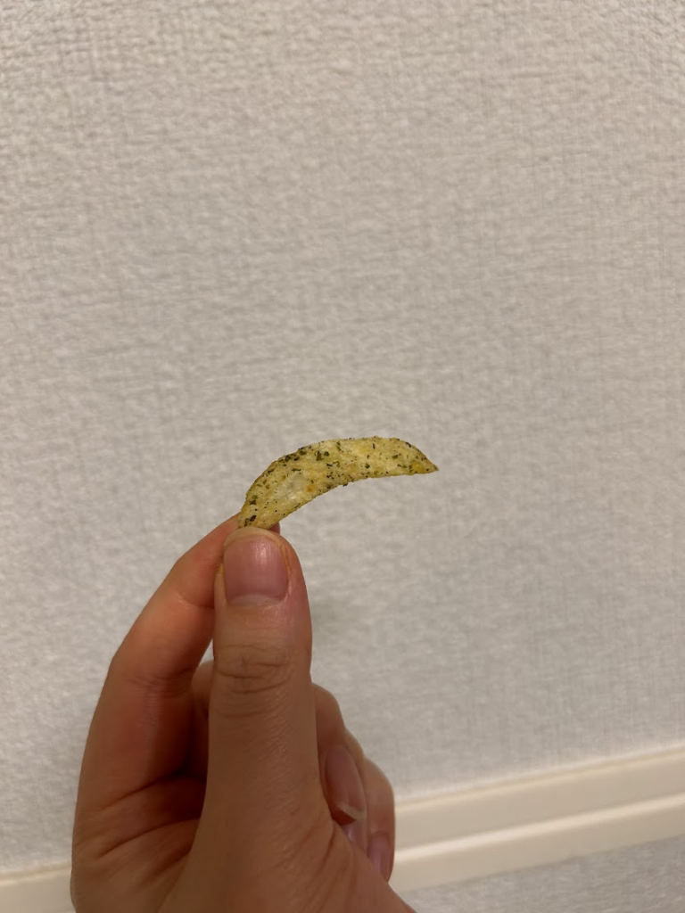 普通の袋のポテチみたいに、まんまるの大きいチップスは少ないです。