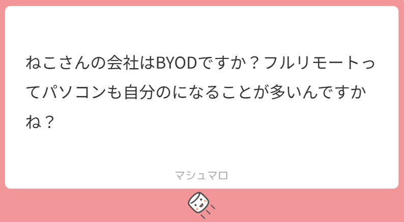 そして、フルリモート=BYODではないと思います!昨今のセキュリティ事情から察してもBYODはかなりリスキーなので、やってるところ少ないんじゃないかな~と思います。